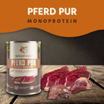Unser Wildfang® Premium Nassfutter Pferd pur eignet sich ideal als Alleinfuttermittel für deinen ausgewachsenen Hund und zeichnet sich durch seine einzigartige B.A.R.F Qualität aus.