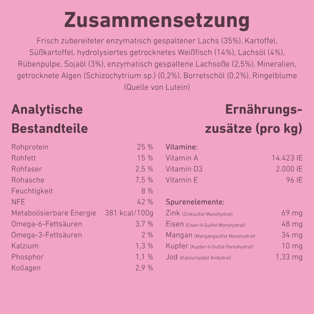 Frisch zubereiteter enzymatisch gespaltener Lachs (35 %), Kartoffel, Süßkartoffel, hydrolysiertes getrocknetes Weißfisch (14 %), Lachsöl (4 %), Rübenpulpe, Sojaöl (3 %), enzymatisch gespaltene Lachssoße (2,5 %), Mineralien, getrocknete Algen (Schizochytrium sp.) (0,2 %), Borretschöl (0,2 %), Ringelblume (Quelle von Lutein).