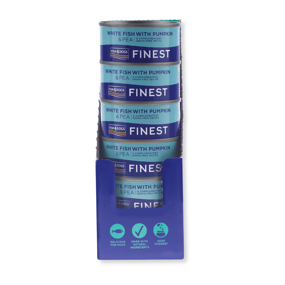 We only ship Fish4Pets products to Germany, Austria and Switzerland. All other countries have a permanent distributor for these products in their own country. Die Rezeptur von Finest Weißfisch mit Kürbis & Erbsen wird aus hochwertigem Fisch und Gemüse hergestellt. Sie wurden entwickelt, um dem Trockenfutter für Hunde Geschmack, Feuchtigkeit und Interesse zu verleihen und es appetitlicher zu gestalten. • Hergestellt aus hochwertigem Fisch und Gemüse • Getreide- und fleischfreie Rezeptur • Ohne Zusatz von künstlichen Farbstoffen oder Aromen • feucht und lecker • Hervorragend geeignet als Topper für Trockenfutter oder als verlockendes Leckerli Zusammensetzung: Weißfisch (50 %), Kürbis (8 %), Erbse (8 %), Tapiokastärke Ergänzungsfuttermittel für Hunde