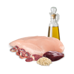 Hühnerhälsen, 28,5% Brühe, 5% Reis, 1% Mineralstoffe, 0,5% Leinöl