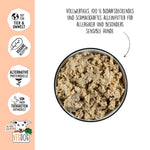Wir verzichten auf alle Hauptallergene des Hundes. Für die ausreichende Deckung des Eiweißbedarfs haben wir Lupinen-, Linsen- und Amaranthproteine verwendet. Diese wertvollen Proteinquellen verfügen über ein optimales Aminosäureprofil für Hunde und stärken damit die Muskeln Deines Vierbeiners. Die zugesetzten Algen stellen die essentiellen Omega-3- und -6-Fettsäuren bereit. Die Super-Zutat Distelöl und die enthaltene Linolsäure sind gut für die Haut und können entzündungshemmend wirken. Abgerundet wird das SENSITIVE durch die Zugabe von gesunden Kräutern wie Löwenzahn, Kamillenblüte und Melissenkraut.